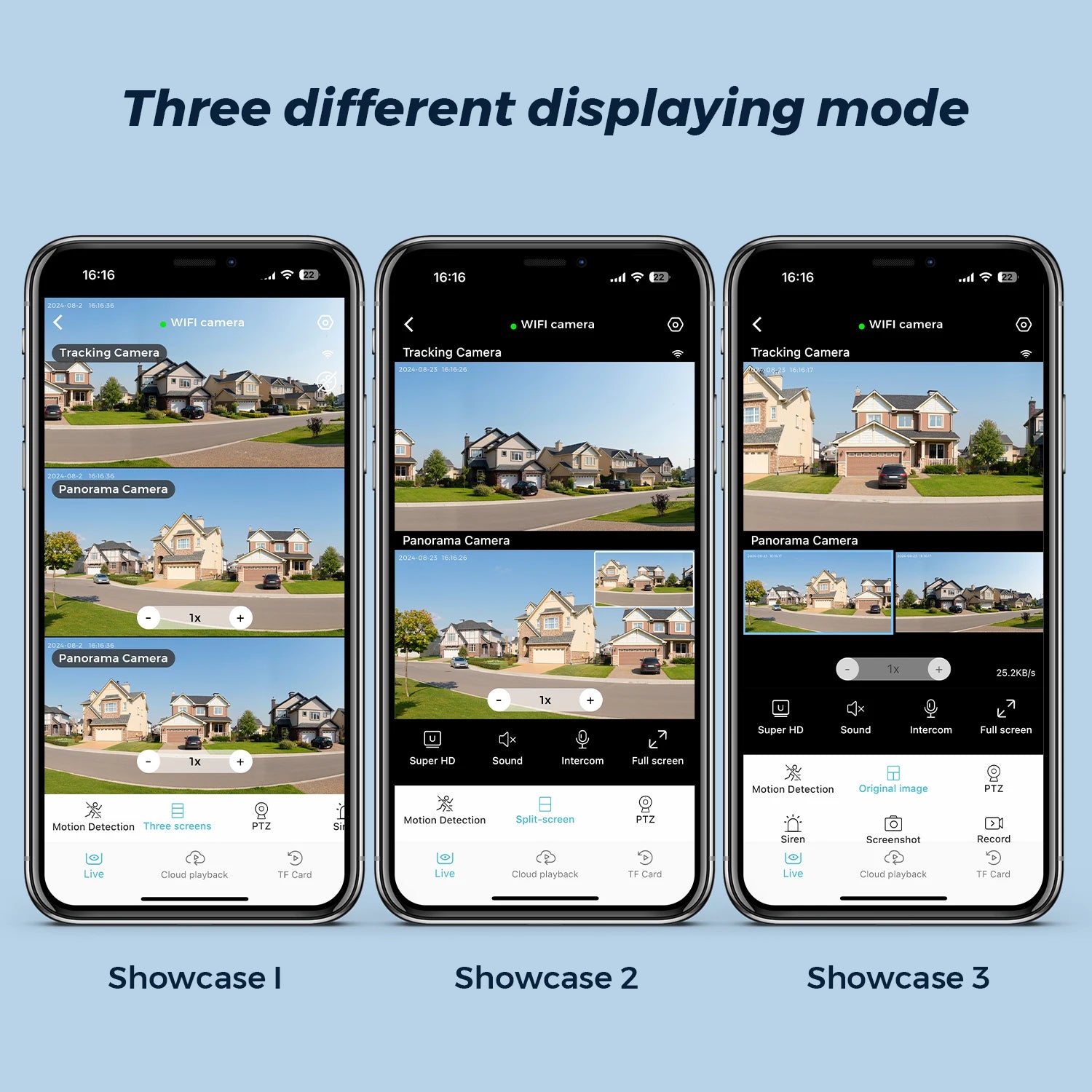 * There are 3 video screens in APP, the upper two is fixed position camera and the lower one is PTZ camera.