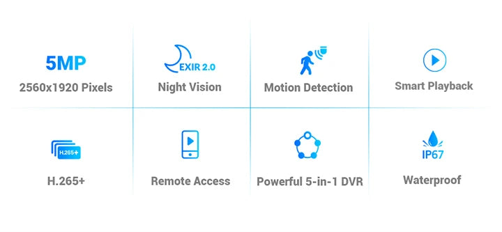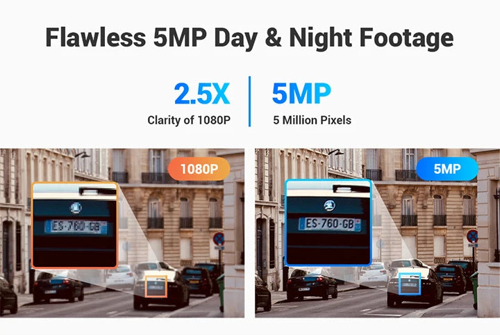 This security system provides 5MP recording and live viewing with a higher resolution (2560×1944). It can be installed at the front door to capture clear human faces and plate numbers, can also be mounted in high positions for rich details of far-away objects.