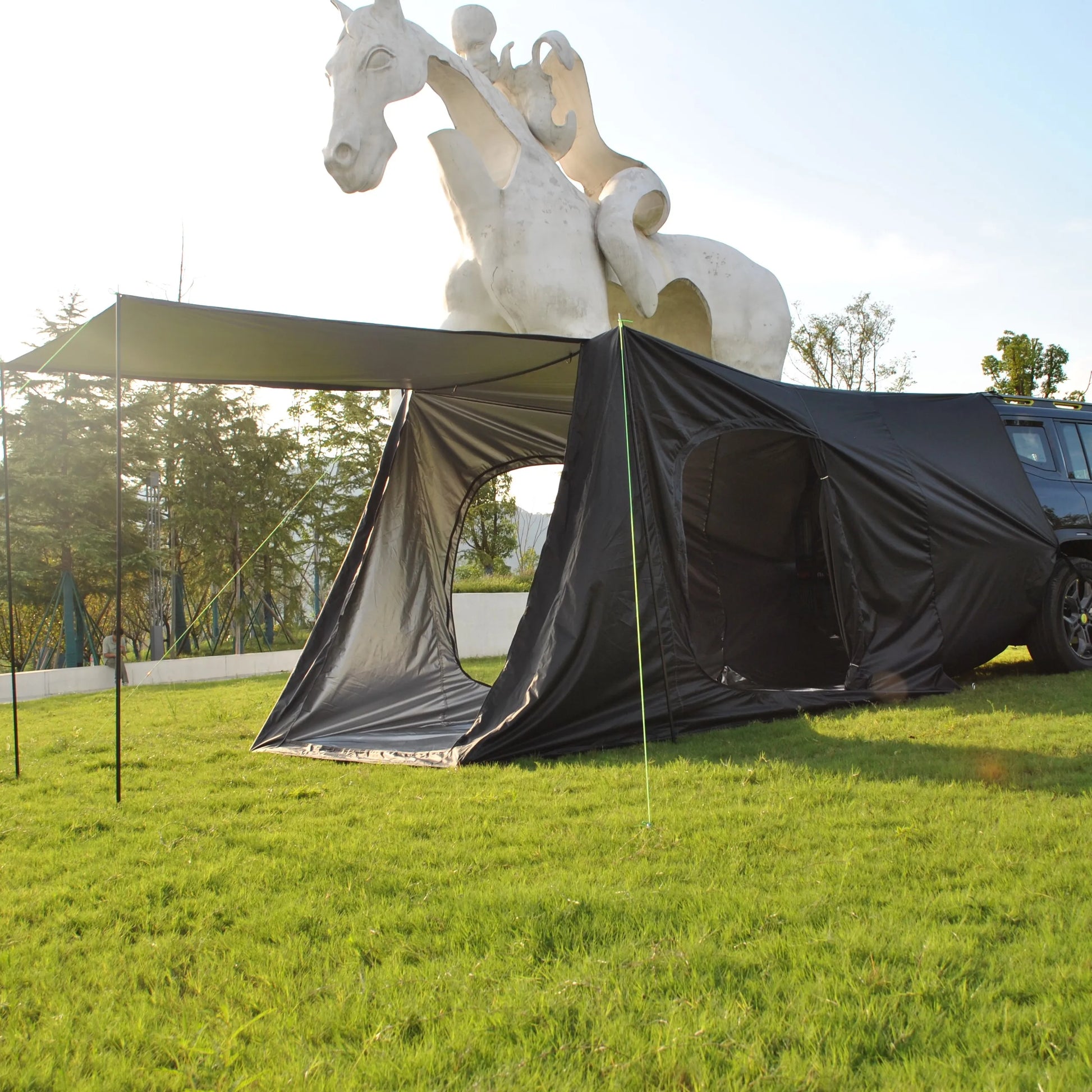 Functional features: This tent is an enlarged version of the rear compartment tent with dimensions of 300cm * 200cm * 210cm when used alone. Suitable for sizes of 3 meters in length, 2 meters in size, and 2 meters in height. It can accommodate 6 adults and can also open the front and side doors, with a total of 3 doors. At the same time, if it can be directly connected to SUVs and most cars, it can be detached from the rear of the car as a separate family camping tent or as a rear tent. The fabric is coated with silver for sun protection, with a waterproof index of up to PU4000, making it the preferred choice for rain and sun protection self driving tour car rear tents.