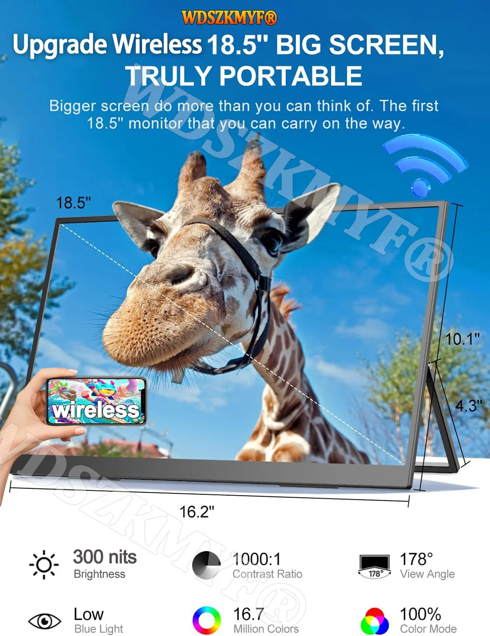 Wireless 18. 5" 15.6" Portable Monitor WIFI Support Mirroring for Phone, Miracast for Laptops, For XBox PS4 / 5 Switch