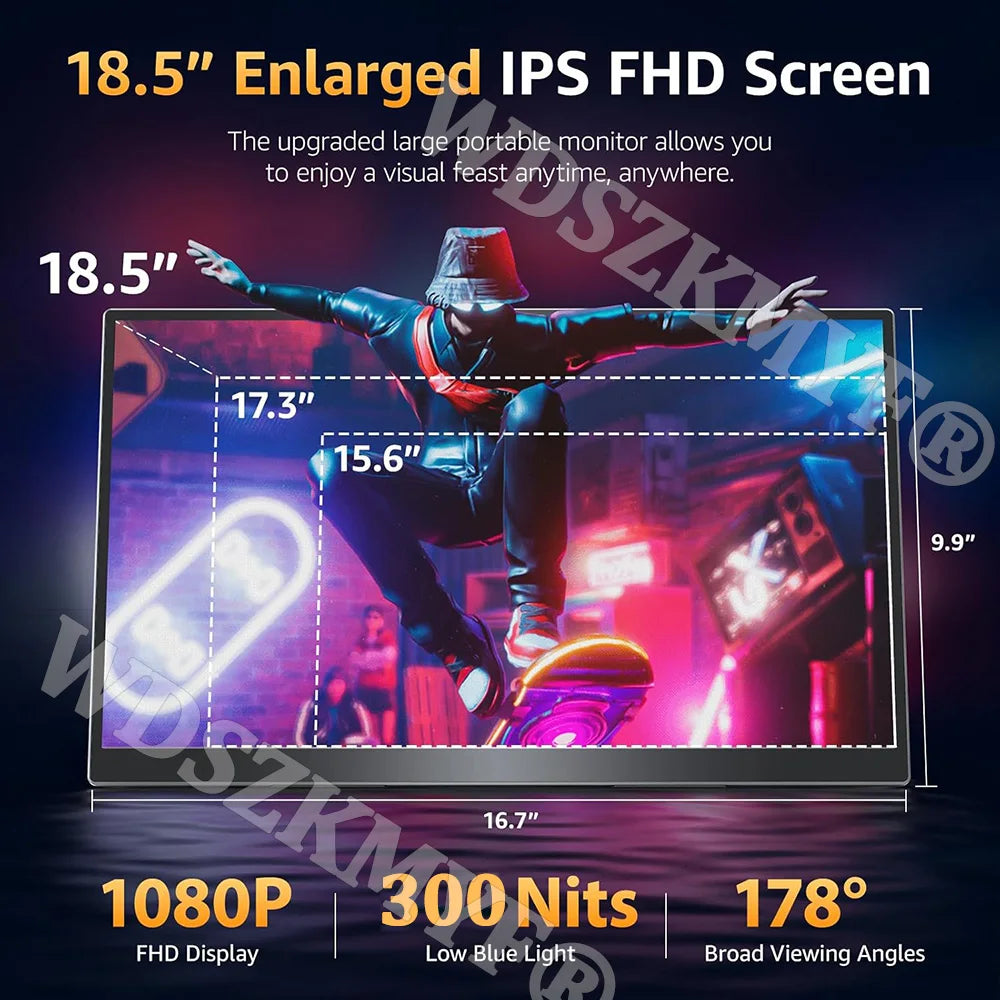 2.1080P Wireless Portable Monitor Built-in Stand: Featuring a 1080P resolution, 60 HZ, 100% color gamut, 178° FULL viewing angle, HDR, and Low Blue Light Ultra Clear A-grade IPS-ADS screen, this FMC 15.6 inch wireless portable screen for laptop has a built-in stable stand with adjustable angle for landscape and vertical mode for high productivity. NOTE: The monitor also comes with two VESA holes and supports VESA Mounting Compliant.