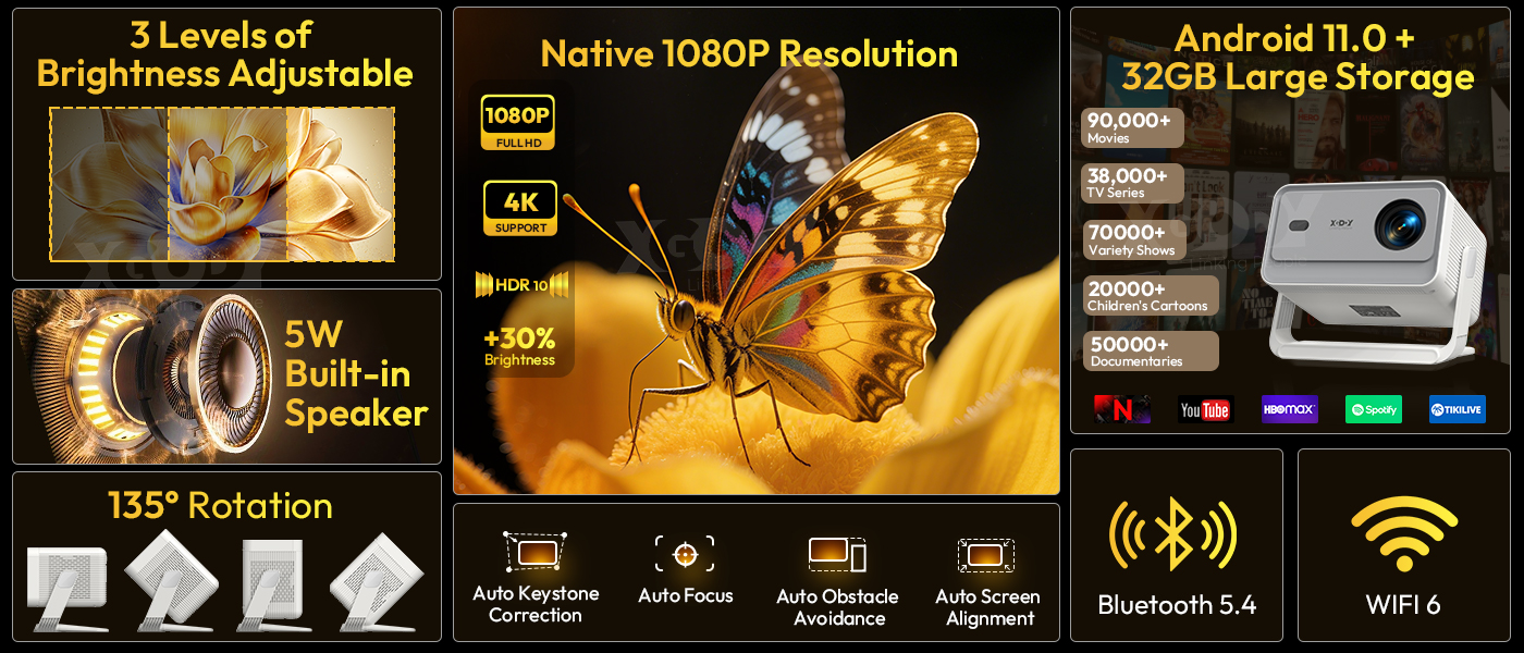 XGODY 4K Projector 32GB Video Projector 650ANSI Native 1080P Autofocus & Keystone Portable Home Theater with Android 11 BT 5.2